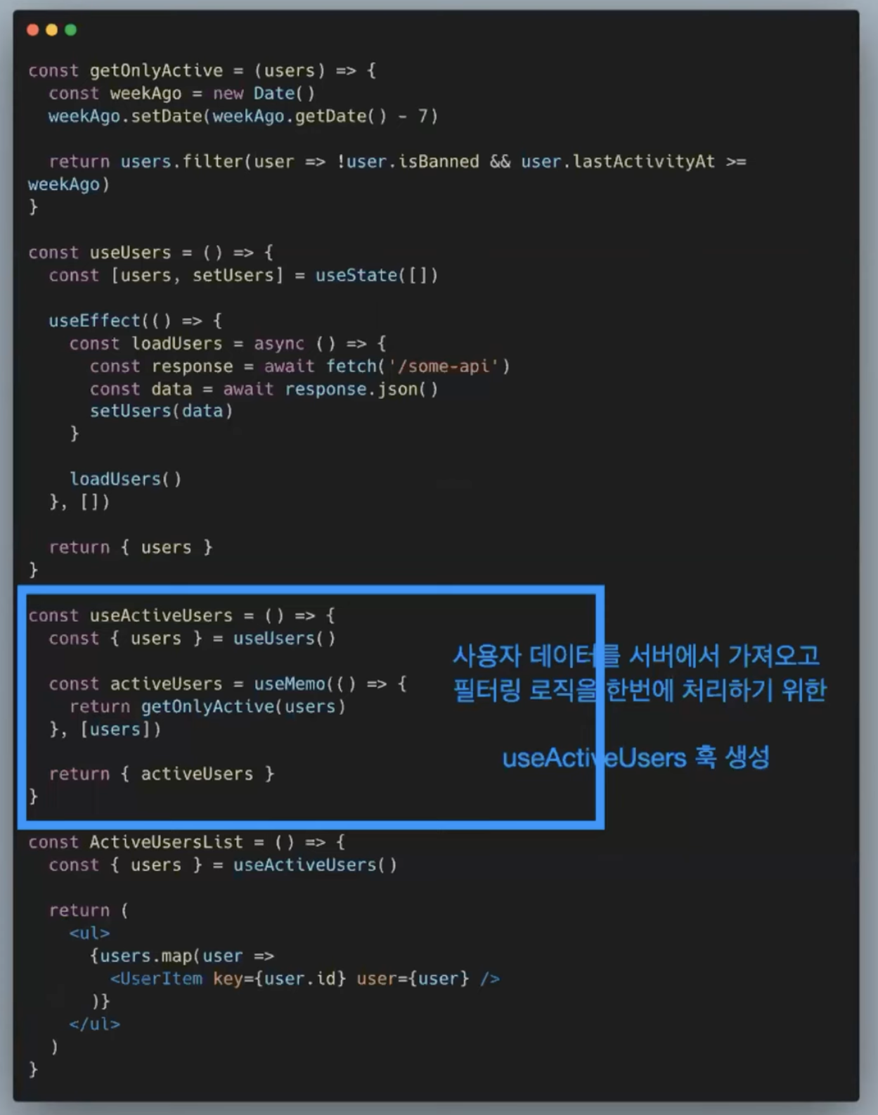 그렇기에 위와 같은 상황은 단순히 관심사 분리를 실행하였다고 느껴지며, 단일 책임 원칙에 의해 나눈 것은 ActiveUserList라는 컴포넌트 자체가 나뉘어진 것 같다