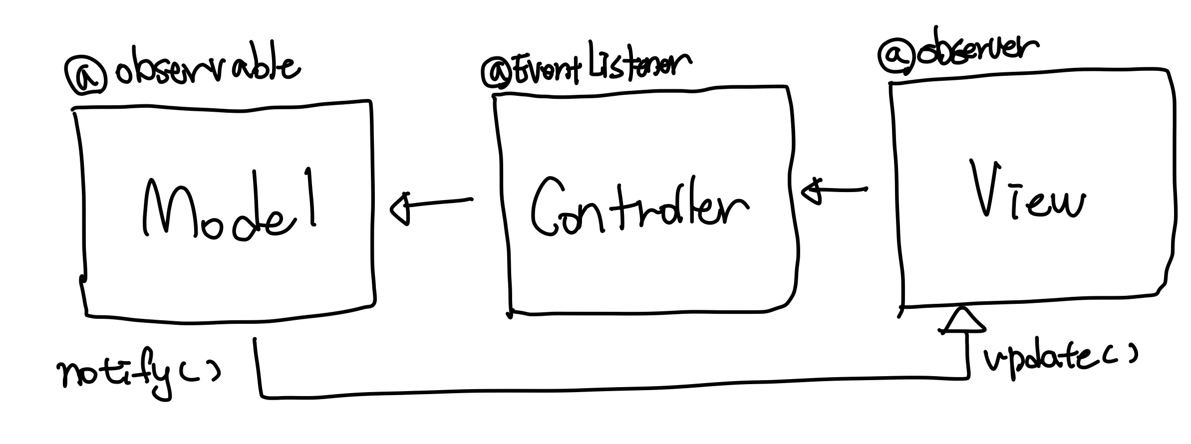 예를 들어 주체라고 볼 수 있는 모델(modal)에서 변경 사항이 생겨 update() 메서드로 옵저버인 뷰에 알려주고 이를 기반으로 컨트롤러(controller) 등이 작동하는 것이다.