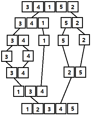 하나의 리스트를 두 개의 균등한 크기로 분할하고 분할된 부분 리스트를 정렬한 다음 두 개의 정렬된 부분 리스트를 합하여 전체가 정렬된 리스트가 되게 하는 방법