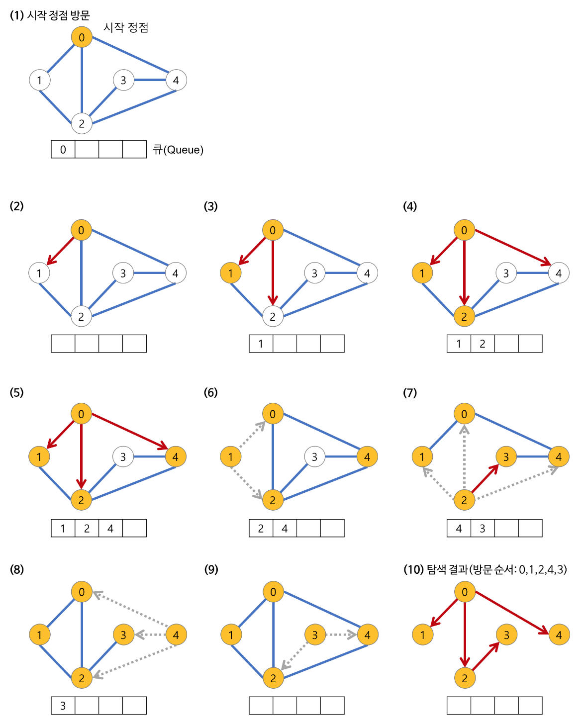 5. 큐가 비거나 모든 노드를 방문할 때까지 반복