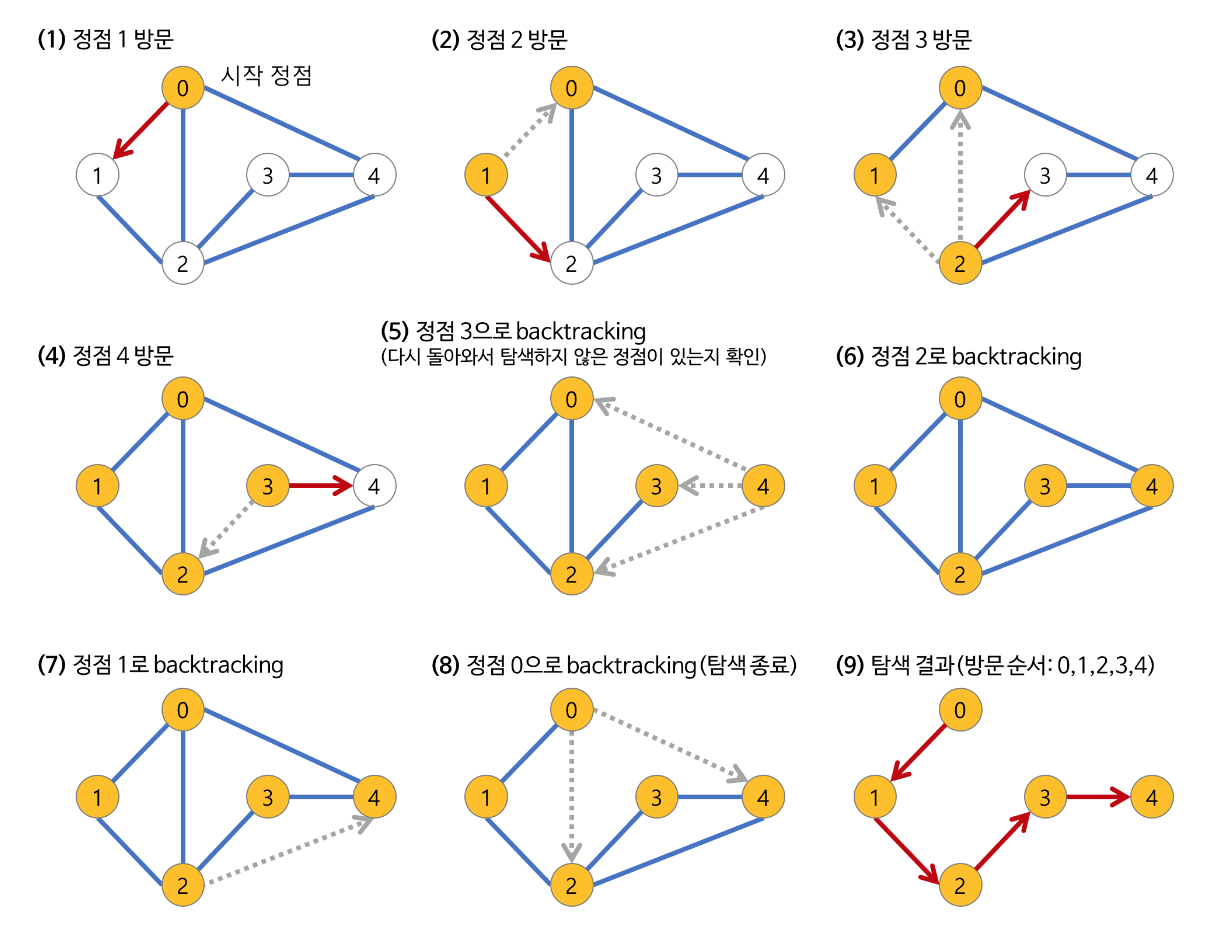 3. 현재 노드에서 더 이상 자식 노드를 탐색할 수 없을 때, 되돌아와서 이전 노드의 다른 자식 노드를 탐색