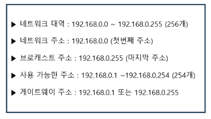 따라서 해당 대역에서 실제적 사용 가능 IP주소 중에 임의로 선택하여 지정할 수 있으며 보통 IP 주소 중 사용 가능한 주소 중에 첫번재 주소나 마지막 주소를 지정함