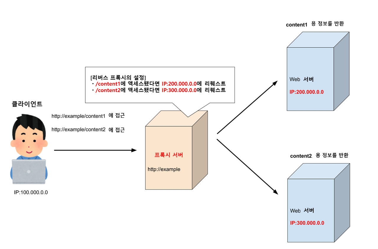 위에 그림 예시의 경우 클라이언트에서 액세스를 프록시 서베에 직약해서 URL에 따라 리퀘스트를 받을 서버가 바뀌도록 설정