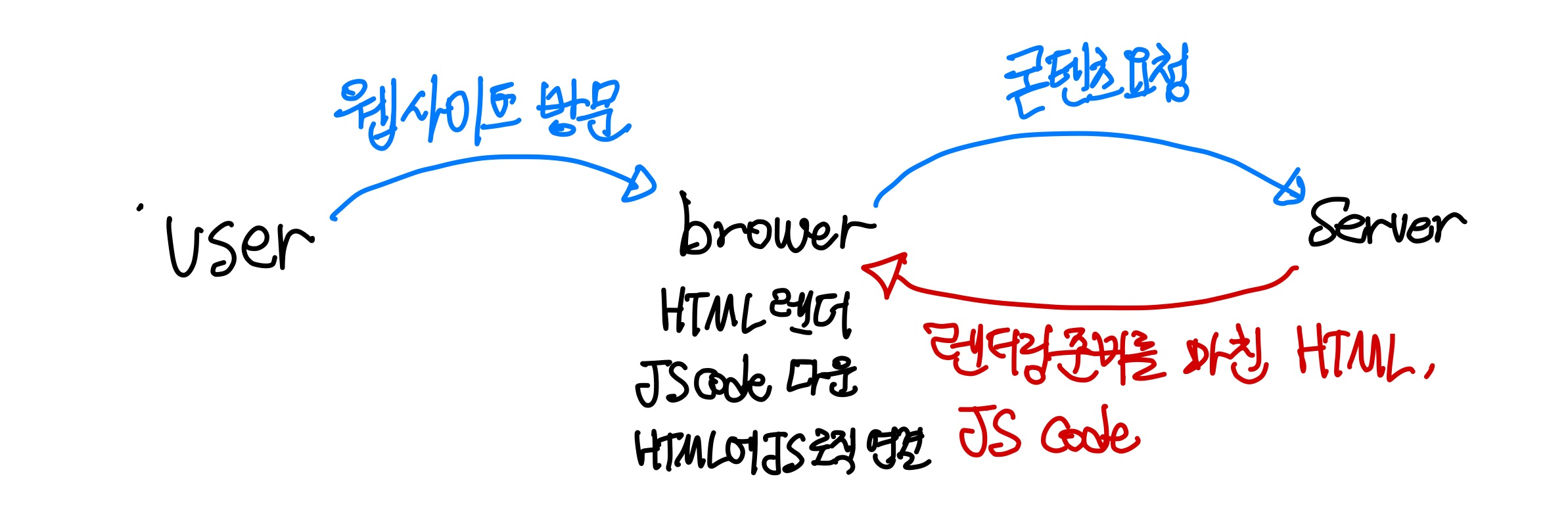 사용자가 웹 사이트에서 방문해서 페이지를 접속하게 되면 페이지가 요청되고 서버로부터 완전 HTML 파일을 다운로드 받아서 화면에 페이지를 바로 띄어서 보여준 다음에 웹페이지를 동적으로 작동하고 제어하기 위해 필요한 자바스크립트 파일을 서버로부터 다운로드 받게 된다. 자바스크립트 파일까지 다운로드가 완료되면 웹페이지를 동적으로 제어할 수 있게 된다. 이후 페이지에 대해서 변경 사항이 있거나 다시 새로운 페이지로 접속했을 때 서버에서는 렌더링 과정을 수행한 다음 웹 사이트 화면을 브라우저를 통해 웹 페이지를 그려준다.