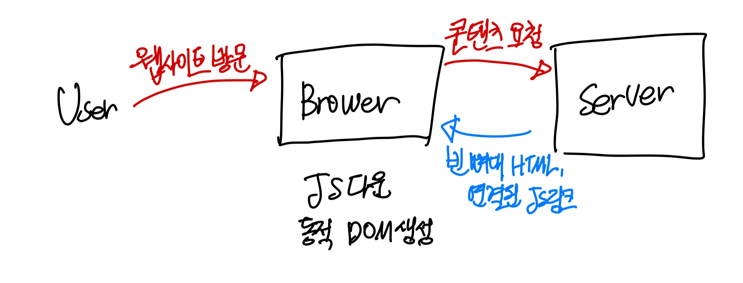 단점 : 처음에 HTML과 자바스크립트 파일이 모두 다운로드 되어야지만 웹페이지가 웹 브라우저에 그려져서 표현되기 때문에 처음 화면 로딩 속도에서 걸리는 단점이 있다. 그리고 빈 HTML파일을 받아온 상태에서 브라우저에서 동작하여 HTML을 구성하기 때문에 SEO측면에서 불리한 부분이 있다.