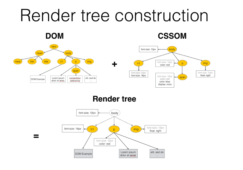 DOM Tree + CSSOM Tree, 렌더링에 필요한 노드만 선택해 페이지를 렌더링하는데 사용
