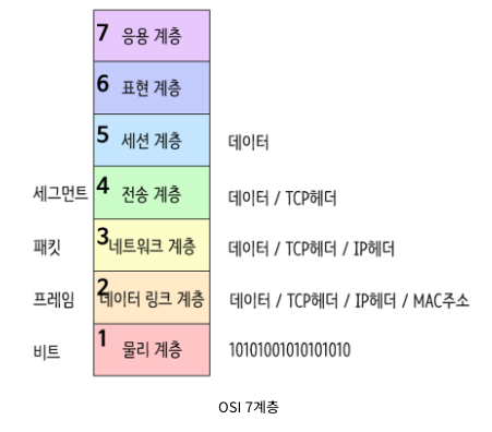 1. OSI 7계층이란? OSI 7 계층은 네트워크 통신이 일어나는 과정을 7단계로 나눈 국제 표준화 기구(ISO)에서 정의한 네트워크 표준 모델이다. 아래 그림에서 아래부터 1계층(물리 계층) ~ 7계층(응용 계층)으로 구성되어 있다. 또 그림과 같이 각 계층을 지날 때마다 각 계층에서 Header가 붙게되고 수신측은 역순으로 헤더를 분석하면 된다. 1계층 - 물리계층(Physical Layer) 주로 전직적, 기계적, 기능적인 특성을 이용해서 통신 케이블로 데이터를 전송하는 물리적인 장비 단지 데이터 전기적인 신호(0, 1)로 변환해서 주고받는 기능만 할 뿐 이 계층에서 사용되는 통신 단위 : 비트(Bit)이며, 이것은 1과 0으로 나타내어지며, 전기적으로 On, Off 상태 신호의 전송속도, 전송모..