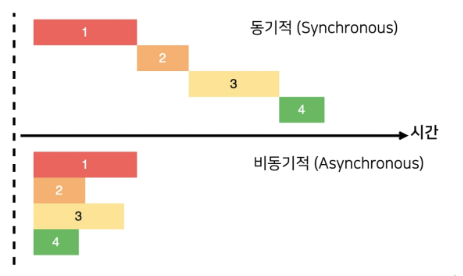 1. 비동기 방식 특정 코드의 연산이 끝날 때까지 코드의 실행을 멈추지 않고 다음 코드를 먼저 생할하는 특성을 말한다. 기다리는 동안 다른 함수를 호출할 수 있다. 2. 동기적 방식 작업이 끝날 때까지 다른 작업을 할 수 없다. 위 그림과 같이 비동기적과 동기적을 나타낼 수 있다. 동기적은 위그림과 같이 1번 작업이 끝나고 2번 그리고 2번 끝나면 3번 이러한 순서로 진행이 된다. 하지만 비동기적은 1번이 끝나기 전에 2번 코드를 실행 그리고 3번 4번 이러하게 진행이 가능하다. 비동기적에서 대표적인 함수는 setTimeout()가 있다. 이 코드는 바로 실행하지 않고 지정한 시간만큼 기다렸다가 로직을 실행한다. 아래와 같이 예시가 있다. function test() { console.log('첫번째')..